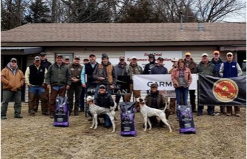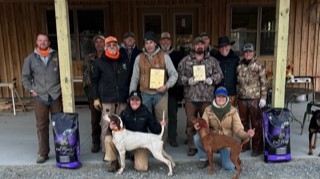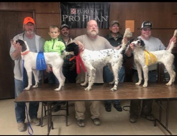 Licking River Bird Dog Club, December 4th trial results. Pictured left to right in front is Amateur Puppy winner Pistols Revolver with Tim Mulavaney owner and Youth handler Jaxson Mulvaney, 2nd place Viatali's Grouseringer Taps with Gary Vitali, and 3rd place Boatright's Maverick with Terry Boatright, in back is Judge Josh Griggs and Judge Gerry Addison