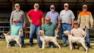 Tulsa Bird Dog Club Amateur Puppy stake winners are pictured, “left to right” Kneeling is Kaulin Ogle with winner Jojo’s Midnight Maggie, Christian Ogle with 2nd place Jojo’s Quick Justice, and Jesse Lambert with 3rd place Scout. Standing is Bob Lias, Frank Schoenborn, Kenny Snow, James Corpening, and Nick Carson.