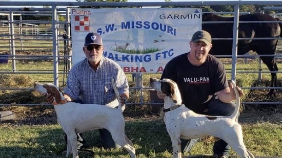 Pictured is Open Shooting Dog Winners from the Southwest Missouri Walking Field Trial Club from left is the 1st place winner Jimfork’s Cool Lady with Kenny Snow and placing 2nd is Unfinish Business with Justin Crook