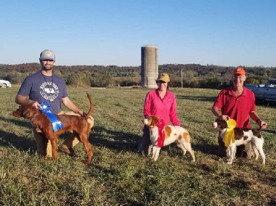 German Shorthaired Pointer Club of Iowa and Vizsla Club of Eastern Iowa, trial results. Pictured from the left, Luke Tewes with 1st place Brook’s White Hot Blaze, Mary Tyson with 2nd place Rebelflame Run For The Roses, and Mike Magnuson with 3rd place Bantam’s Dr Jac’s Shooter.