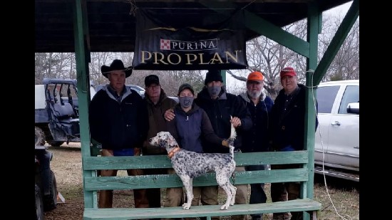 NBHA National Open Shooting Dog Winners pictured from left to right; NBHA President Ken Sauer, Jillian Stuhr, Garry Malzone with 3rd place Indian Creek Courageous Cat, Ana Lea Sasser, Emmit Sasser with 1st place Sulphur Bend Woodman, NBHA Secretary Tim Penn, and Penelope Sasser.