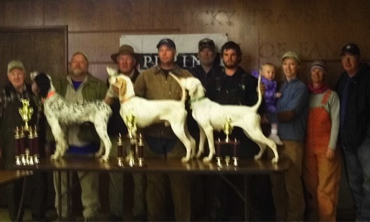 The Dewey Mullins Open Shooting Dog Classic stared April 3rd and concluded on April 5th with the derbies running on Friday and the judging seminar on Friday evening. We thank the Somerset Bird Dog Club for hosting these events and look forward for bigger and better next year. We have a lot of people to thank and I don’t want to miss anyone. These events could not have been possible without the help of Purina, NBHA, Gun Dog Supply, Somerset Bird Dog Club; Waste Connections were a major sponsor in this event. Pam and Buster Tucker were there for us when we needed help. Jim Crouse and Georgie Casey did the judging assignments and handled things top notch. This trial was named for a great KY Sportsman and at the age of 92 Mr. Dewey Mullins watched every dog in every race and had his opinions. We thank Chris Mathan from Strideaway for coming and taking pictures of the grounds and dogs. The judging seminar was a great success with a panel of Jim White, Jim Crouse, Dewey Mullins, John Russell and moderated by Georgie Casey; Job well done by all.