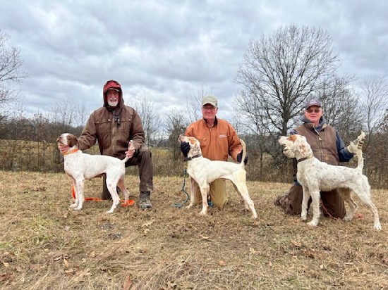 Licking River Bird Dog Club, December 4th trial results. Pictured left to right in front is Amateur Puppy winner Pistols Revolver with Tim Mulavaney owner and Youth handler Jaxson Mulvaney, 2nd place Viatali's Grouseringer Taps with Gary Vitali, and 3rd place Boatright's Maverick with Terry Boatright, in back is Judge Josh Griggs and Judge Gerry Addison