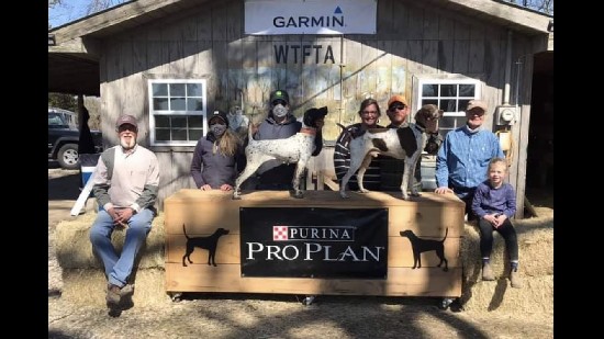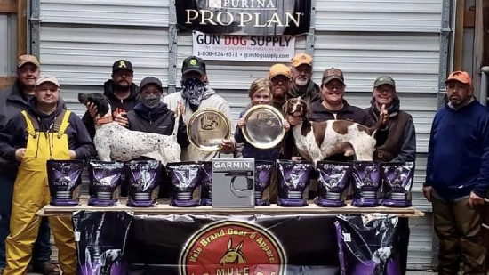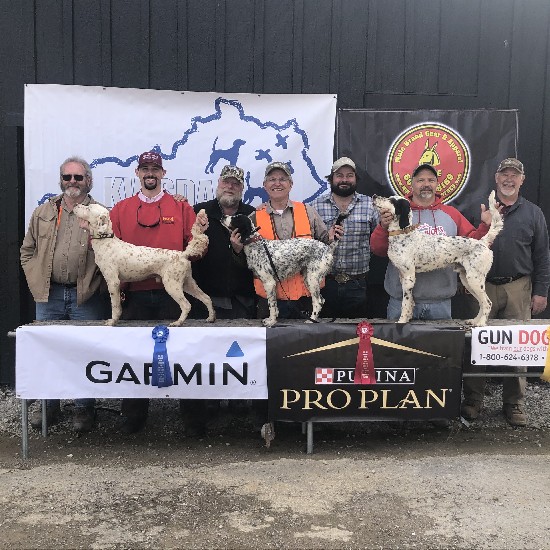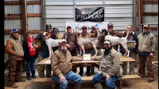 NBHA National Open Shooting Dog Winners pictured from left to right; NBHA President Ken Sauer, Jillian Stuhr, Garry Malzone with 3rd place Indian Creek Courageous Cat, Ana Lea Sasser, Emmit Sasser with 1st place Sulphur Bend Woodman, NBHA Secretary Tim Penn, and Penelope Sasser.