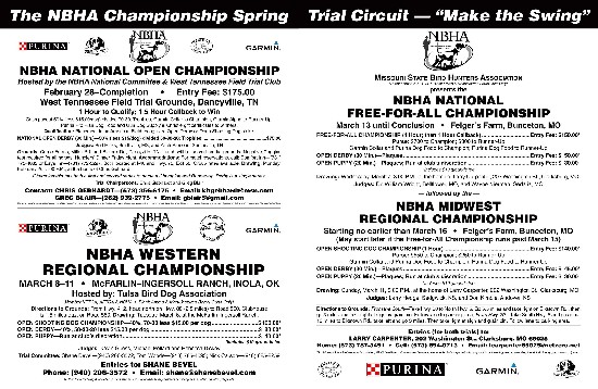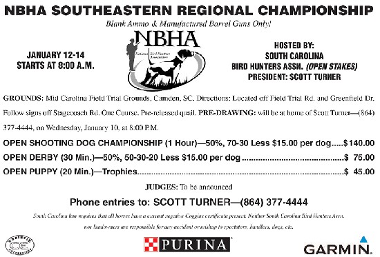 January 12-14, 2018. Camden, SC - Scott Turner 864-377-4444. Please review all specifics for entry here in this post. It is also on the American Field website. Due to electronic communication issues with the Field, this ad may not be published until a week or so prior to the event.