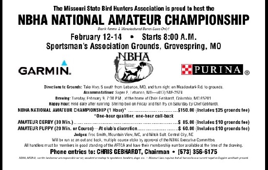 The NBHA National Amateur Championship will be held Feb 12-14, 2016 at the Sportsman's Association Grounds, Grovespring, Mo. The judges for this year's running will be Fred Smith, Mountain View, Mo and Mitch Solt, Central City, Ne. Look for the ad in an upcoming field for more information. This is always a great event over some of the best trial grounds in the Midwest. Covered and outdoor stables, kennels, and clubhouse. RV and trailer hookups on site.