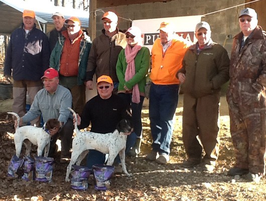 The Tallapoosa Field Trial Club held its second field trial of the season on Jan. 4, 2014 at the home of Marty and Linda Robinson in Carrollton, GA. We had cool temperatures for this running with the low in the morning around 24 and the high in the mid 40’s. Given the weather, we had a moderate turnout and wish to thank all the participants and spectators who came out in support of the trial. We would like to greatly thank our NBHA national sponsors; Purina Pro-Plan, Garmin, Gun Dog Supply and Christie Enterprises for their continued support of the NBHA organization. We had two very experienced Gentlemen judging this trial in Bruce Mercer of Jonesboro, GA and Tom Conn of Dallas, GA. Both Bruce and Tom have been very generous through the years with their time in helping us keep out trials run fairly and with the utmost integrity. Both judges were very attentive to each dog in competition and the winners were justly awarded. Many thanks to the folks who “make it happen”. Danny Robinson kept the courses seeded with quail and was also responsible for the firewood that was used to knock of the chill when there was time to gather around the fire barrel. Stanley McCain was on hand to take care of Treasury duties and kept the dog wagon running all day. Stanley was a welcome sight on several occasions when some of the nice derbies went deep at pick up and took handlers quite a ways from headquarters. Randy Robinson came over from Stockbridge, GA and he drove the tractor pulling the gallery wagon. On hand to serve up lunch were Whitney (Robinson) Berry, Melissa McCain and Jackie Robinson. Melissa prepared a big pot of Chili which was an incredible hit on such a “wintry” day.