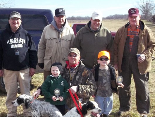 North Missouri Field Trial Association hosted a National Bird Hunters Association field trial on January 19th at the White Oak Ranch near Edina Mo. North Missouri Field Trial Association would like to recognize two youth participants Jace Holman and Nathan Penn, who were present with their dads to run their puppies in the Open Puppy stake. Pictured are the Youth Participants and members of the North Missouri Field Trial Association (Front; Nathan Penn and his puppy Daisy, Tim Penn NMFTA club member, Jace Holman and his puppy Buster. Back Row; NMFTA club members Dr. John Niebruegge, Don Hilliard, Kevin Western, and Charles Beeler)