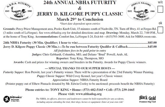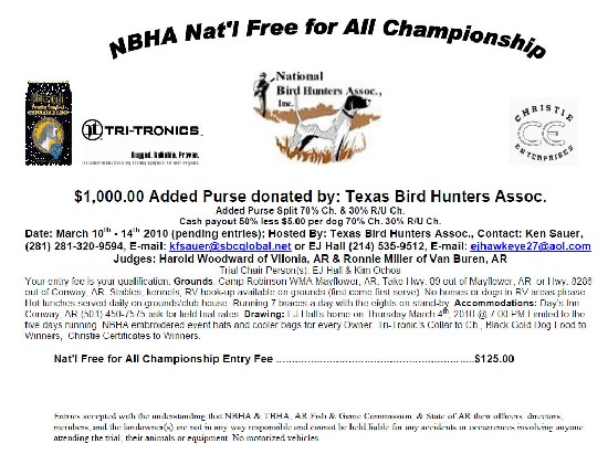 "Big Purse to Winners" Texas is proud to host the 2010 running of the NBHA Nat'l Open Championship "Free for All" at Camp Robinson, AR. Great grounds and facilities. Horse stalls, kennels, & club house at gounds. There will be lunches served daily at clubhouse catered by "Mayflower Restaurant" thanks to Janic Stroud. Your entry fee is your qualification. No motor vehicles on course. Camp Robinson is a great venue. A special thanks to Black Gold for dog food to the winner, Tri-Tronic's for an E-Collar to the Champion, and Christie Enterprises for certificates to the winners. We can't forget a special thanks to the TX Bird Hunters Assoc. for the "ADDED PURSE". Drawing: EJ Hall�s home on Thursday March 4th, 2010 @ 7:00 PM Limited to the five days running. NBHA embroidered event hats and cooler bags for every Owner.