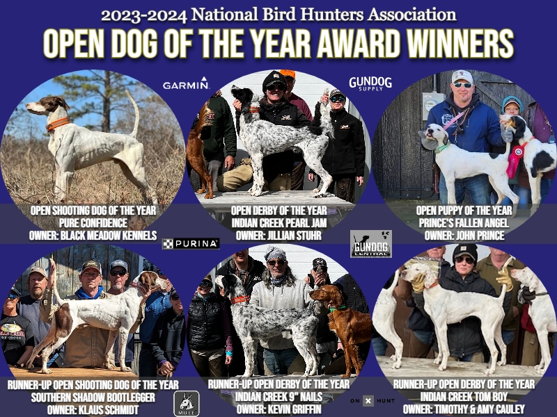 The National Bird Hunters Association is thrilled to announce and celebrate the highly esteemed Dog of the Year and Handler of the Year awards for the 2023-2024 Field Trial Season.