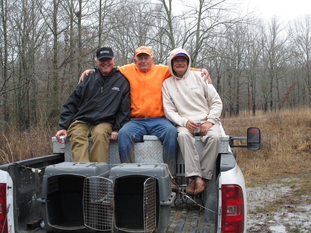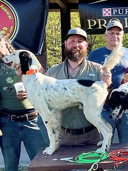 North Missouri Field Trial, Open Derby winners. (l to r) Jillian Stuhr with the winner Indian Creek Pineapple, Dr. Willian Wright with 2nd place Milomix Blaze, and Dan Draffen with 3rd place Ms Belle. In the back, Garry Malzone, Joe Zimmer, Judge Robert Warner, and Judge Tim Penn